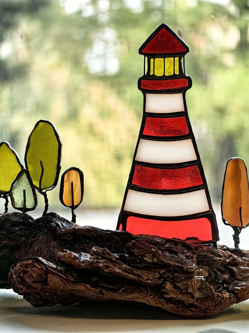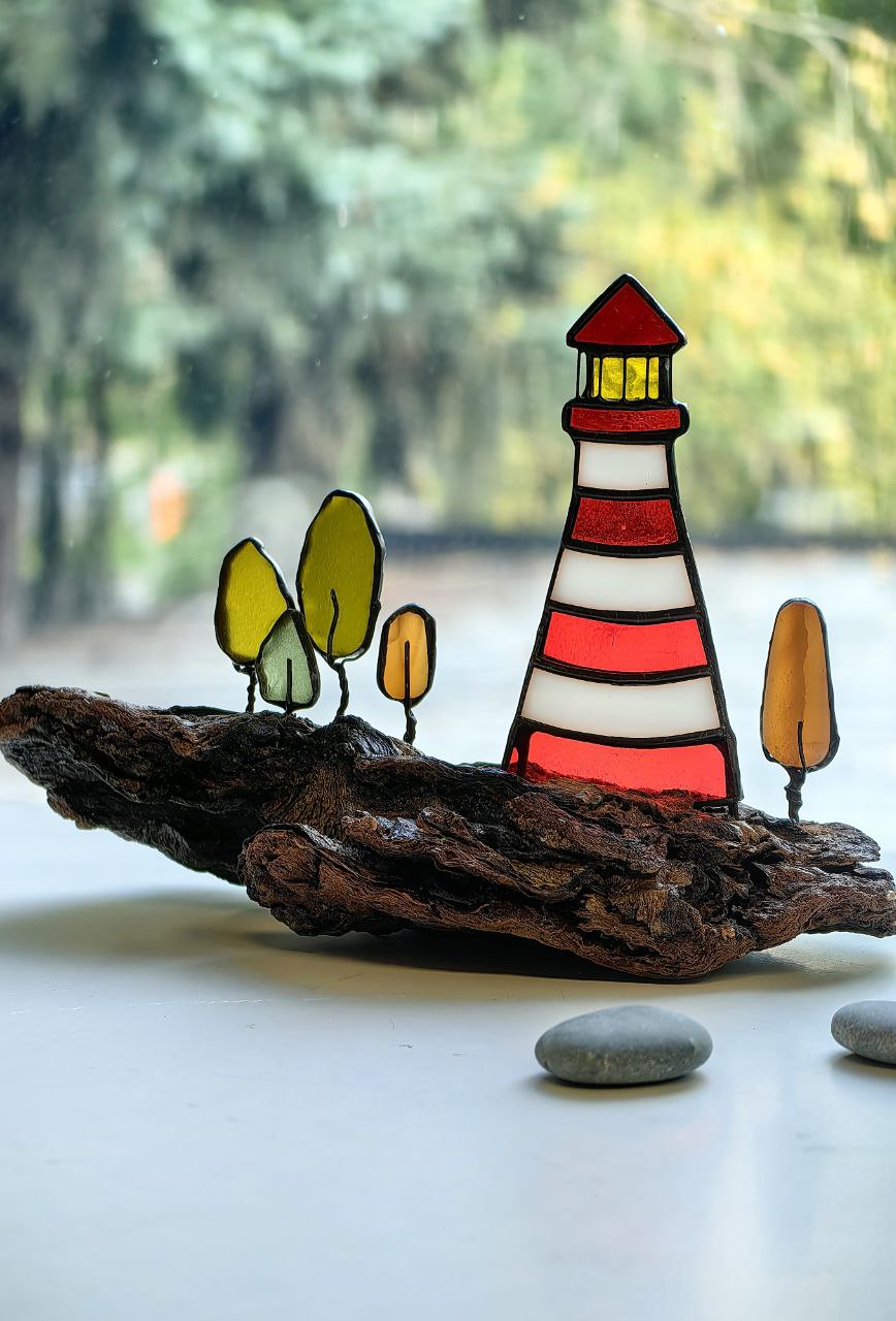 Маяк выполнен их цветного стекла, витражная техника Тиффани. Основание — дрифтвуд.