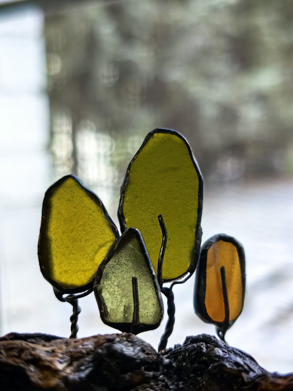 Композиция Маяк — витраж в технике Тиффани, основа дрифтвуд, деревья — морские стёкла.